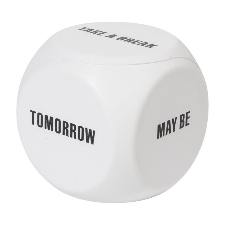 Dice shaped, decision maker antistress ball in PU foam. Including the following messages: Take a break, Tomorrow, Maybe, Yes, No and a blank side for printing, in white color