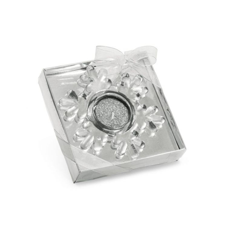 Candle in snowflake-shaped glass base. Gift box included. Product in silver color