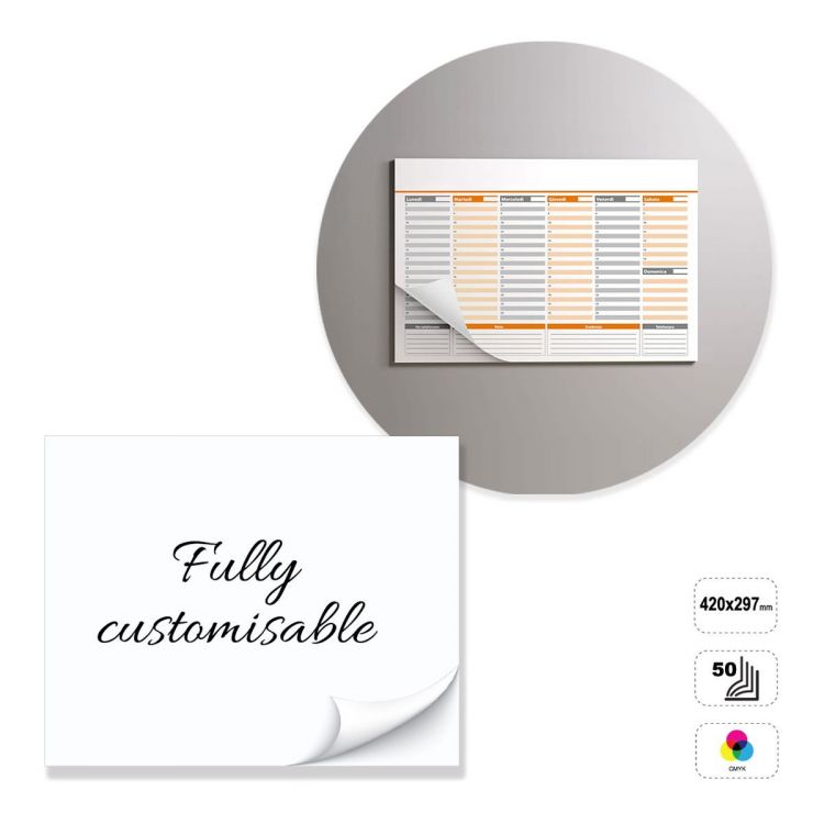 Horizontal desk planner, fully customisable. The product consists of 50 sheets of 90-gram paper glued at the top. Product can be printed on the front or front and back in full colour. Non-printable 300 g white cardboard backing. The planner can be customised by modifying the preset template, or completely constructed following the guidelines provided in a neutral template.