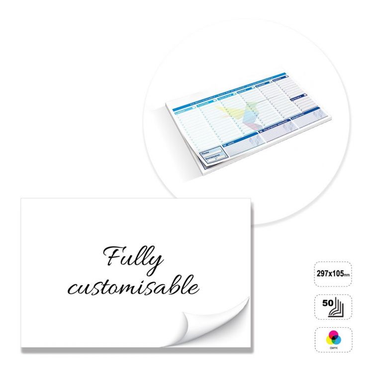 Horizontal desk planner, fully customisable. The product consists of 50 sheets of 90-gram paper glued at the top. Product can be printed on the front or front and back in full colour. Non-printable 300 g white cardboard backing. The planner can be customised by modifying the preset template, or completely constructed following the guidelines provided in a neutral template.