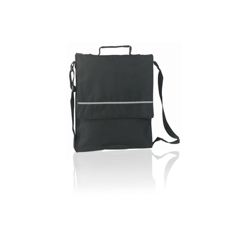 Document bag with velcro closure flap in brightly colored 600D polyester with reflective front stripe. With matching color reinforced handles, adjustable shoulder strap and inside compartments with pen and smartphone pockets.