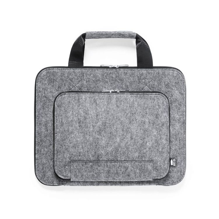 Nature line document holder made of resistant, recycled RPET felt. The result of the combination of the recycling processes of plastic materials along with the millenary technique of felt manufacturing, resulting in an eco-trend material that, in addition to being of recycled origin, also becomes recyclable. Main and front pockets with zip closures and metal pullers, with matching reinforced handles and RPET emblem on outside label. (grey color)
