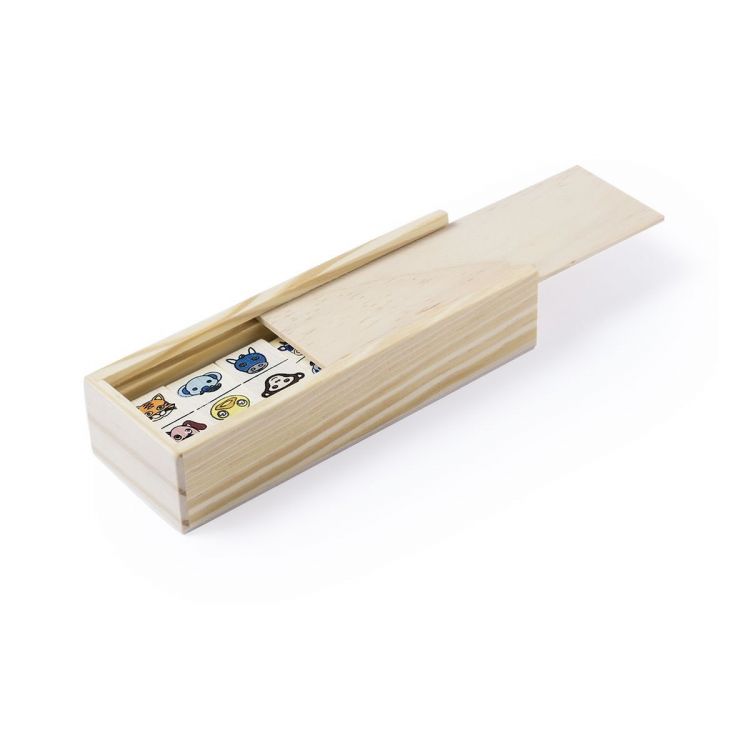 Cheerful domino of little animals in wood. With 28 pieces of wood and presented in wooden box with cover. (neutral color)