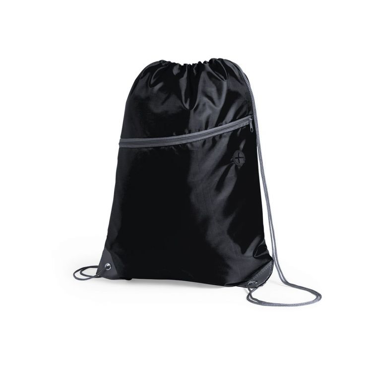 Drawstring backpack made of soft 210D polyester. With front zipped pocket and headphone outlet. Self-closing strings in grey colour, matching zip and corners with metal eyelets and PU leather reinforcement. Avaiable in a wide range of colours.