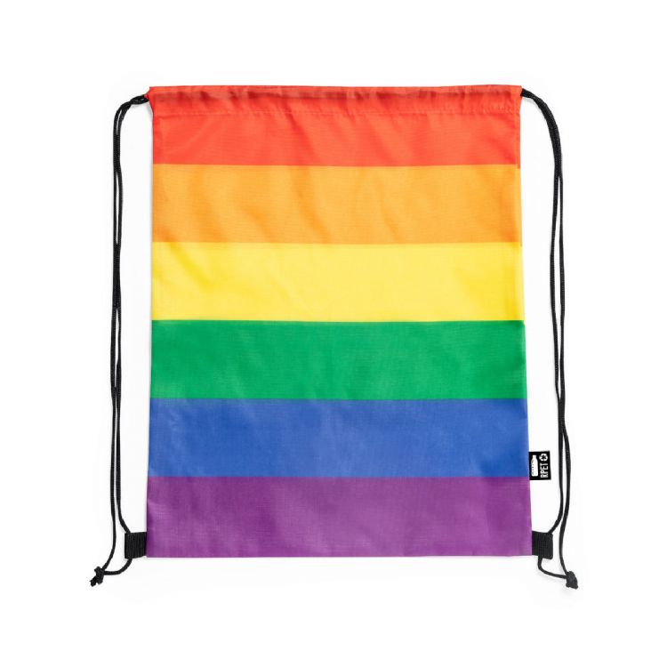 Multicoloured Rainbow drawstring backpack, made of RPET 210T. With stitched finish and premium closure strings. A backpack to be proud of, with outside label with the RPET distinctive.RPET material is made from recycled plastic, to encourage the reuse of plastic waste and help the sustainability of the planet. (multicolor color)