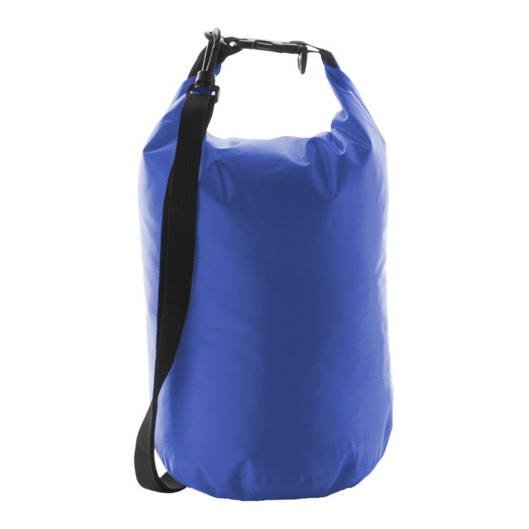Waterproof, ripstop dry bag with adjustable shoulder strap, plastic buckle and carabiner.