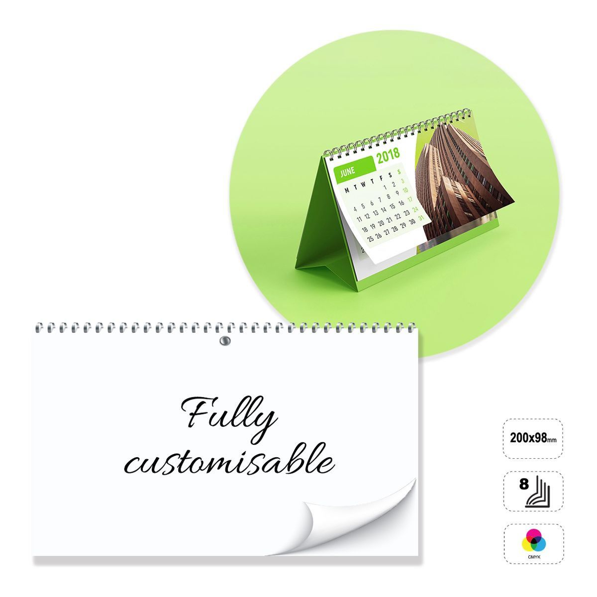 Horizontal desk calendar, fully customisable. The product consists of 8 sheets of 135 gram matt coated paper, printable front or front and back in full colour. Bound with a silver, white or black metal spiral at the top. Non-printable 300 g white cardboard backing. The calendar can be customised by modifying the preset template, or completely constructed following the guidelines provided in a neutral template.