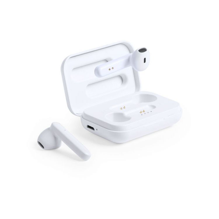 Earphones in elegant white finish and Bluetooth® 5.0 connection. Ergonomically designed, including touch control button integrated in the earpiece, with matching charging base. Handsfree and rechargeable, with micro USB cable included. Presented in a deluxe individual case with hinged lid and in an attractive design box. (white color)