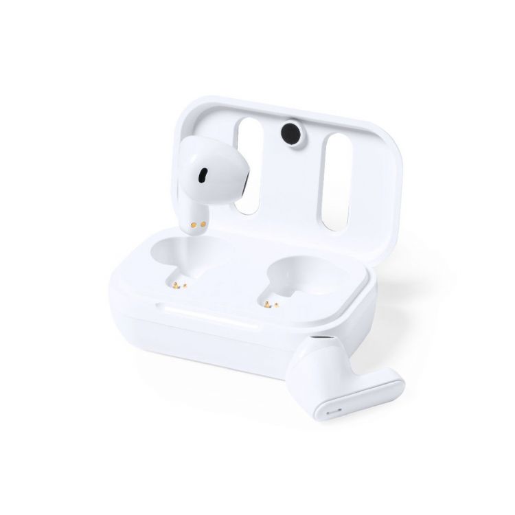 Bluetooth® earphones, made of RABS and in stylish white color, with the lid of the charging base lined in recycled leather.Bluetooth® 5.1 connection, hands-free function and 30 mAh battery. Ergonomically designed, with integrated touch control button on each earpiece and LED charging status light. Matching charging base with 300mAh battery. Including Type C charger cable and instruction manual in English and Spanish. Presented in an individual kraft design box.RABS or Recycled ABS material and recycled leather come from the recycling of items at the end of their lifespan. The recycled materials used include RCS certification, which guarantees their recycled origin. (brown color)