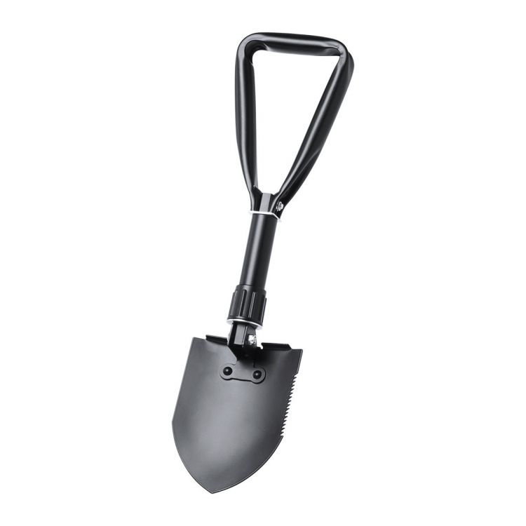 Foldable, carbon steel emergency shovel with carry pouch, in black color