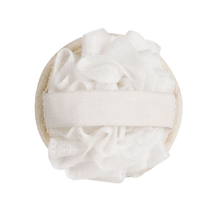 2 in 1 exfoliating sponge in PE fiber. On the one hand, soft sponge and on the other hand exfoliating sponge with fastening strap adaptable to the palm of the hand. (neutral color)