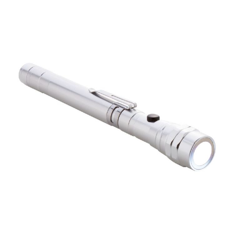 3 LED aluminium flashlight with extendible and flexible head, magnet on top and metal side clip. Including button cell batteries. Max. length: 57 cm.