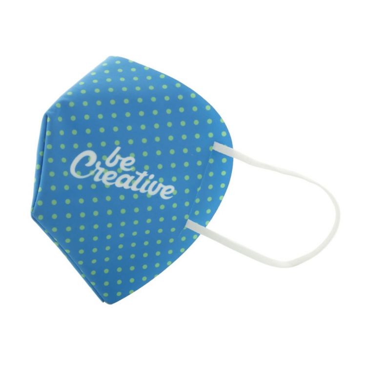 Custom made, washable and reusable face mask cover for FFP2 and KN95 type face masks with sublimation printed graphics. It can be attached to face masks by threading the earloops through the slits of the cover. Made of 100% polyester (190 g/m²). Price includes sublimation printing. MOQ: 50 pcs. Delivered without face mask.