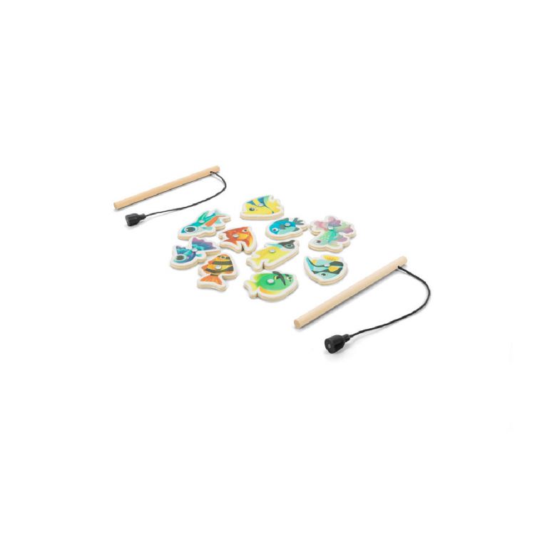 Fishing set made up of 10 wooden fish, with a magnet in the centre and a design on only one side of the piece. Includes 2 wooden rods with black fabric ribbon and plastic tip with magnet to catch the fish. A fun game for the whole family. Supplied in a kraft paper gift box. As the product is made from natural materials, the colour and the printing result may vary between products. Product in neutral color