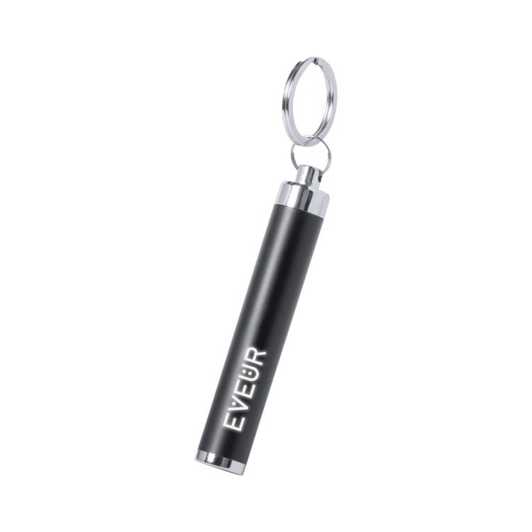 Plastic flashlight with 1 LED and metal keyring. Logos engraved on body are illuminated. Including button cell batteries.