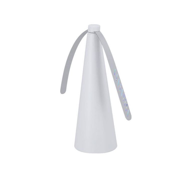 Fly repellent fan designed to effectively keep insects away silently. Includes two blades equipped with 9 silver UV effect lines that create an effective visual pattern to repel flies and other insects. Its conical base guarantees stability on any surface. With on/off button. Totally portable. Ideal for use indoors or outdoors. Operates with 2 AA batteries (not included). (white color)