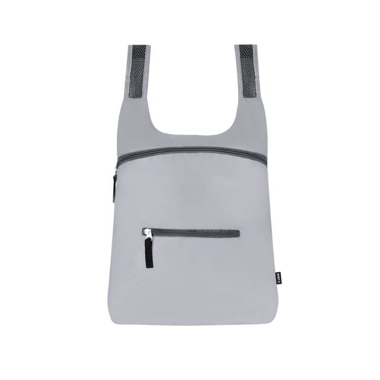 Folding backpack made of RPET. Made using fabric with high reflectivity, thanks to millions of reflective pigments and based on the principle of light retro-reflection, a nighttime visibility property consisting of the refraction of light back to its source. With zipper closure and front pocket. Adjustable shoulder straps made of breathable material. Folds into a small size, with a transport strap. Includes RPET designation.RPET material is made from recycled plastic, thus promoting the reuse of plastic waste and helping the planet's sustainability. (grey color)
