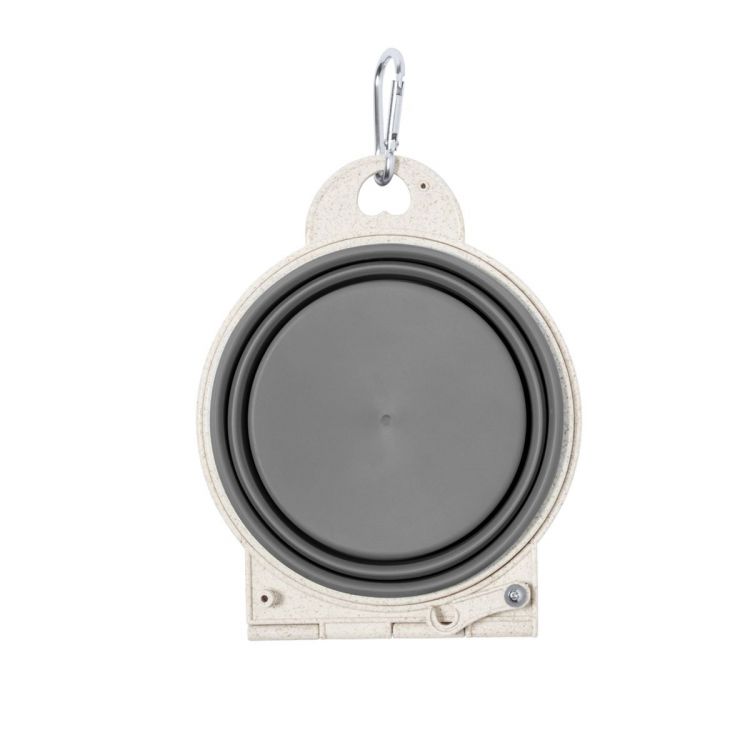 Foldable pet bowl made of wheat straw. Compact design, with two compartments and perfect for use anywhere. Includes handy, easy-to-attach carabiner. Presented in an individual recycled bag.Wheat straw promotes the use of natural raw materials, thus reducing pollutant emissions. (grey color)