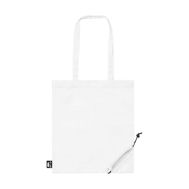Foldable RPET shopping bag with long handles. 190T RPET polyester, with distinctive RPET label.