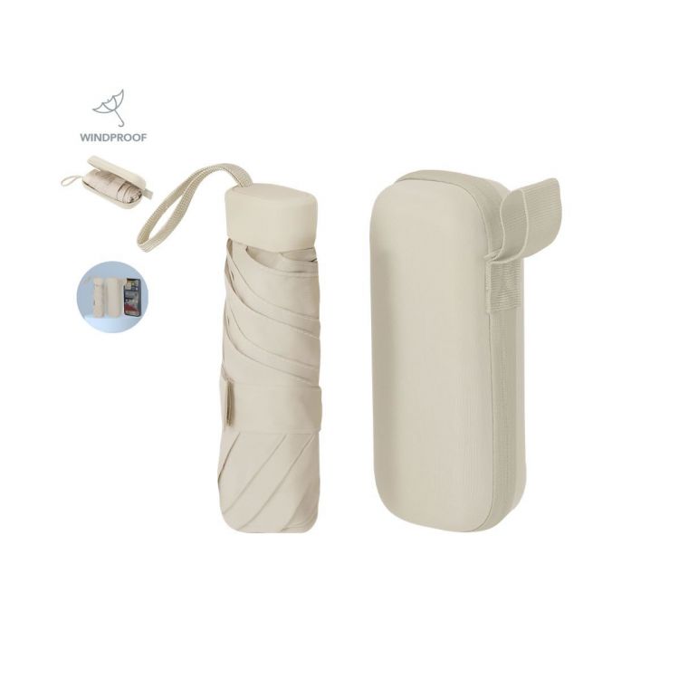 Foldable umbrella with a diameter of 90 cm made from 190T polyester with 6 panels. With manual opening, windproof system, and fiberglass ribs. Compact handle and matching strap. Presented in a rigid transport case made from PU with zipper closure and matching strap.