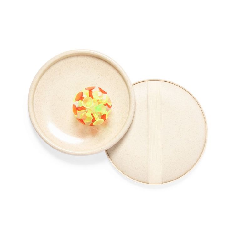 Set of ball and disc paddles. Including ball with suction cups and flat disc paddles, made of resistant wheat straw, with matching elastic strap for the hand. Wheat straw promotes the use of natural raw materials, reducing pollutant emissions. (neutral color)