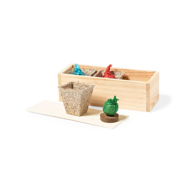 Garden kit with coriander, parsley and basil seeds. Sachets in wooden case with planting instructions, distinctive Made in Europe and with 3 independent compartments. Presented in an attractive individual box with eco design and kraft finish. (neutral color)