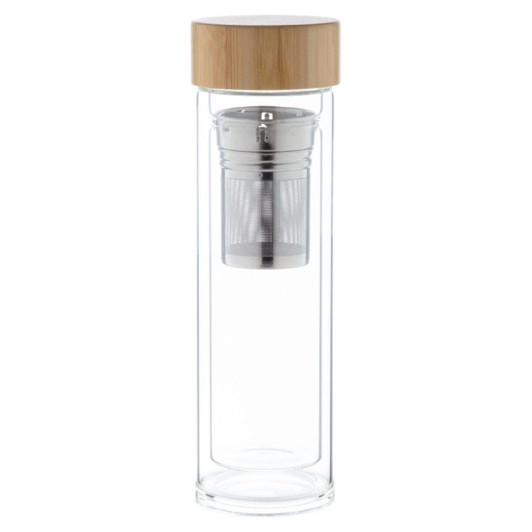 Double-wall, borosilicate glass insulated bottle with tea infuser and bamboo lid. 420 ml