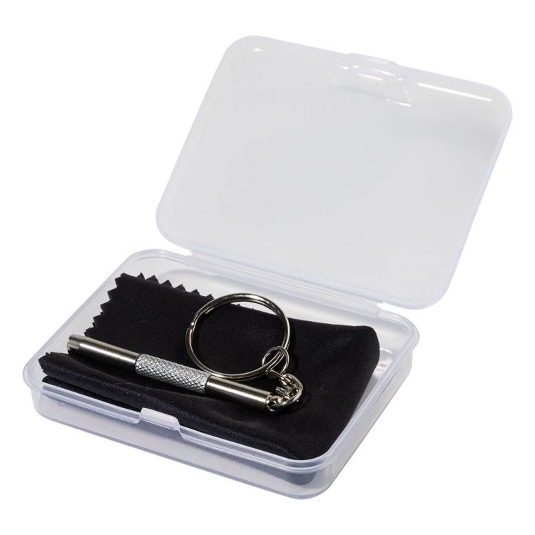 Compact glasses repair kit in transparent PP box. Including 100% RPET microfibre (220 g/m²) cleaning cloth and mini screwdriver with keyring. Cloth size: 18×15 cm.
