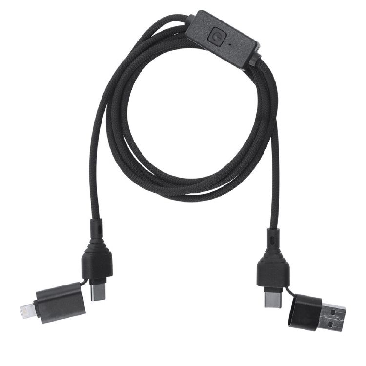 60W charging and data transfer cable with data protection system. Made of recycled aluminium combined with RPET and recycled ABS. Features an integrated security button that allows deactivation of the data transfer function — a practical solution to protect personal and confidential information when using the cable in public spaces, preventing unauthorised access or hacking attempts. Input connections: Type-C and USB; output connections: Type-C and Lightning. Recycled aluminium is a material with almost infinite recycling possibilities, without losing its original properties and consuming less energy in the process. RPET material is made from recycled plastic, encouraging the reuse of plastic waste and contributing to the planets sustainability. (black color)