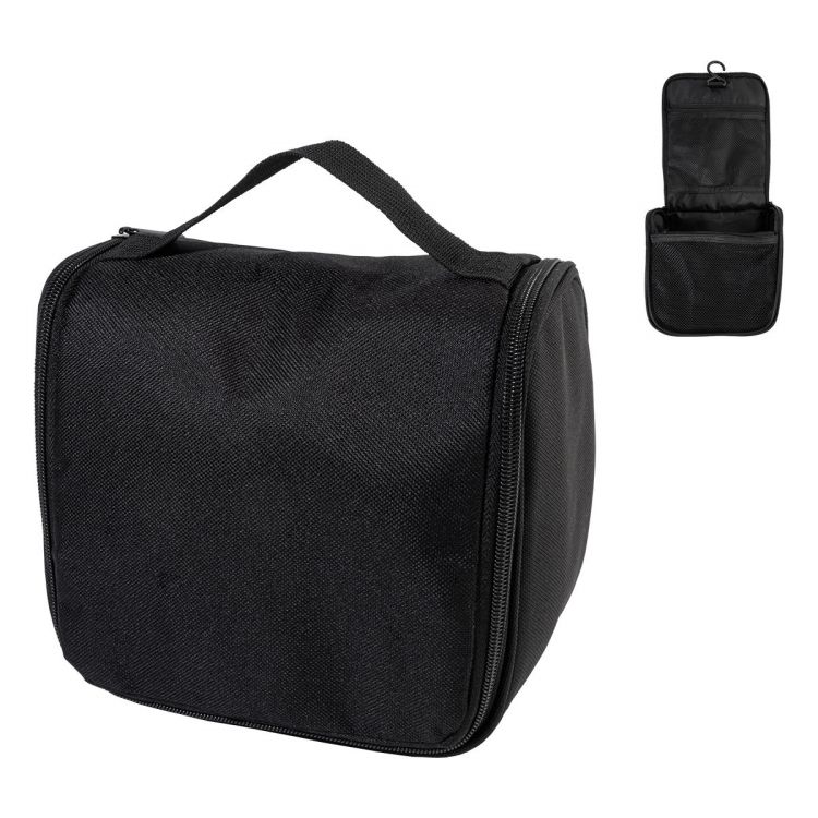Hanging RPET cosmetic bag with zipped inside compartments and mesh pockets. 600D RPET polyester, with distinctive RPET label, in black color