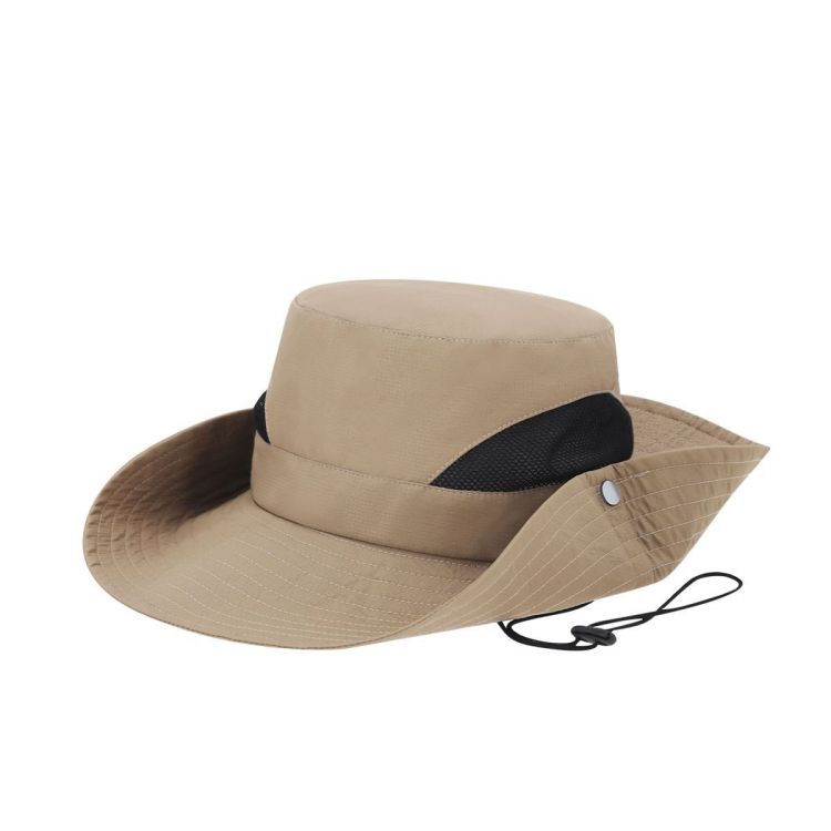 Safari-style hat made from durable polyester material. Comfortable interior, with refreshing side ventilation mesh made from breathable fabric. Adjustable brim with metal button closures and adjustable carrying cord.