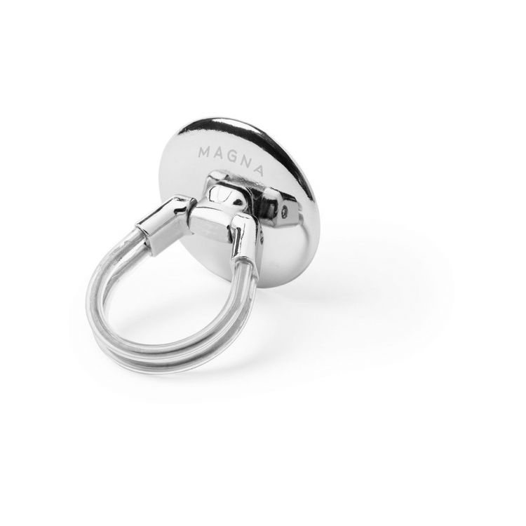 Selfie, smartphone holder in chromed metal. In an elegant design and with 3M adhesive tape, extra strong fixation and residue free when detached from the device. Backside, double holder ring for fingers and vehicle dashboard. Presented in an individual, design bag. (silver color)