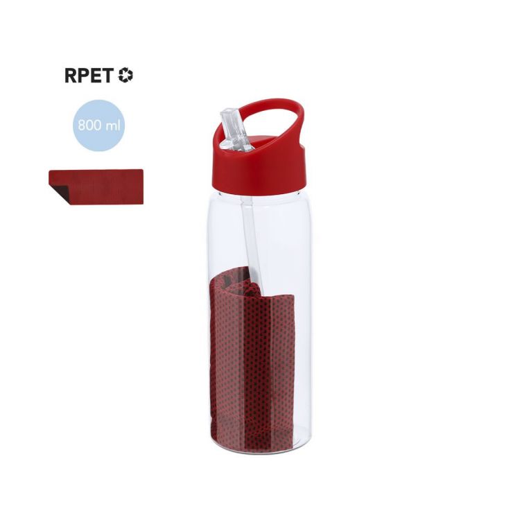 Set of bottle and towel made of RPET. Bottle with 800 ml capacity with easy-open BPA-free system with a straw dispenser and matching transport handle, along with a matching towel of 30x80 cm. RPET material is made from recycled plastic, thus promoting the reuse of plastic waste and helping the planet's sustainability.