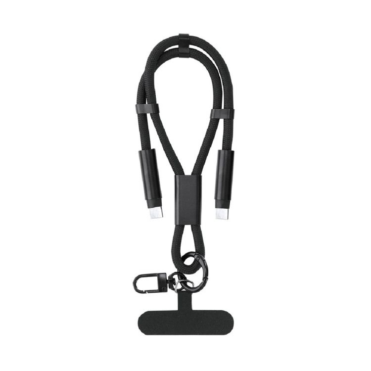 Bracelet with stand function and charging cable, made of a combination of RPET polyester. Designed to be easily placed between the case and the smartphone thanks to its carrying accessory. Includes matching strap, black metal swivel carabiner and wrist adjustment accessory. It offers charging and data transfer functionality, with 60W Type-C input, and Type-C outputs.