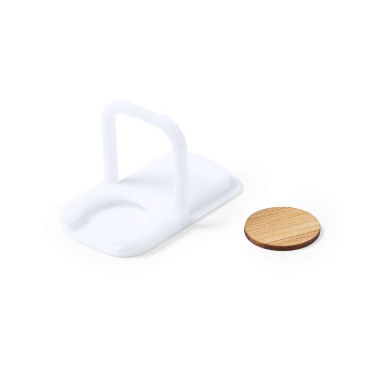 Multifunction smartphone holder with integrated coin for shopping trolley and folding ring/holder. Body made of durable ABS in white finish, with bamboo coin. With adhesive tape, extra strong fixation and residue free when detached from the device. (white color)