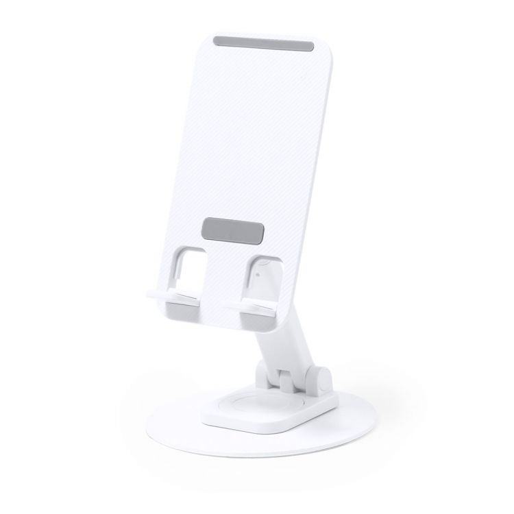 Foldable holder for smartphone and tablet, made of durable aluminium and ABS. Height adjustable, with non-slip rubber pads on base and holder. In sober white or black finish, and with large branding surface. Presented in an attractive design box.