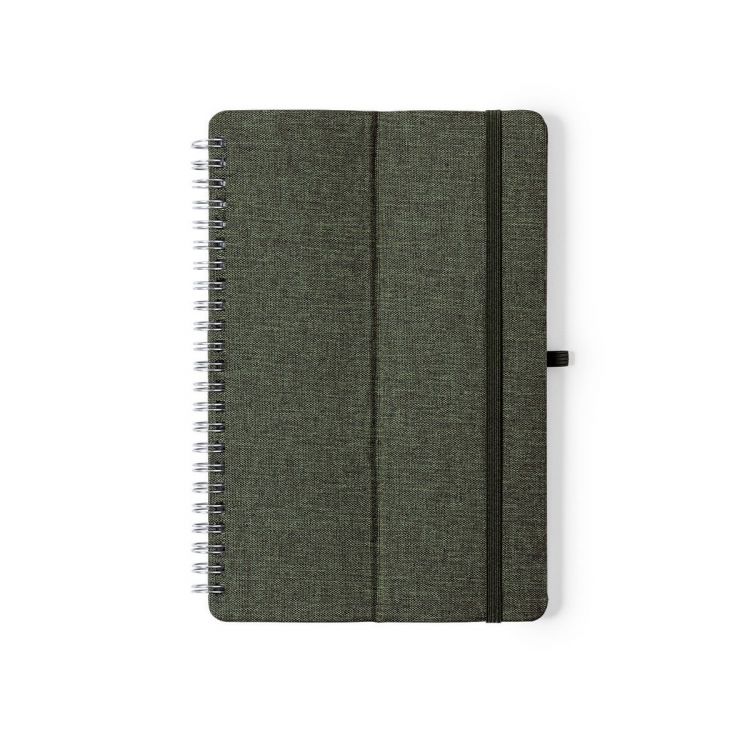Nature line ring binder notebook. Hard covers made in resistant RPET 300D material, made from recycled plastic. With original smartphone and tablet holder integrated in the cover and made of wheat straw. Including elastic closure and matching pen holder. 70 pages inside with single-stripe layout and available in a wide range of colors. With RPET logo on the back cover and presented in an individual recycled bag.