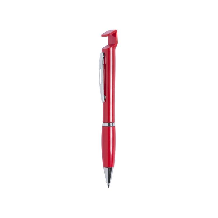 Ball pen with mobile devices holder. Push-up mechanism and bold bicolor design with silver colored accessories and smooth body finished in fun solid colors. With original die-cut metal clip in matching color and comfortable grip. Blue ink. (red color)