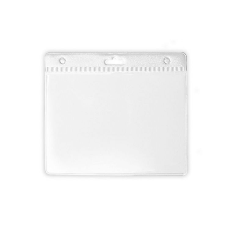 Identifier stamped in PVC with header in varied colors, transparent front window and back in white.