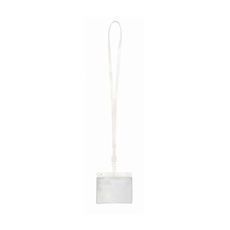 Identifier in PVC with matching color lanyard in bright tones and with carabiner closure. Circular tablet for printing.