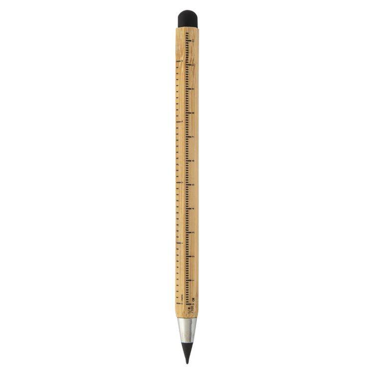 Bamboo long-lasting inkless pen with touch stylus and metal alloy tip, which oxidizes the paper. With hexagonal barrel including 11 cm and 4 inch rulers. This pen writes similarly to a pencil, and it is also erasable