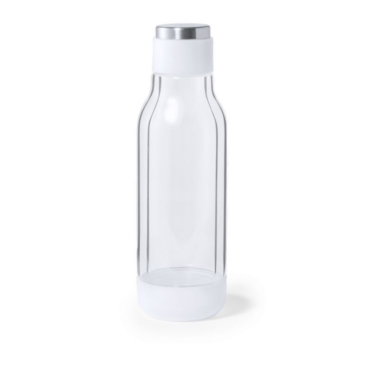Double-walled thermal bottle, in an original, high quality design and with a capacity of 500 ml. Made of borosilicate glass, which offers exceptional resistance, aesthetics and durability, thus reducing the consumption of disposable products. Innovative transparent case allowing to see the inside, in combination with white color, and manufactured with insulating materials. Presented in an attractive design box. (neutral color)