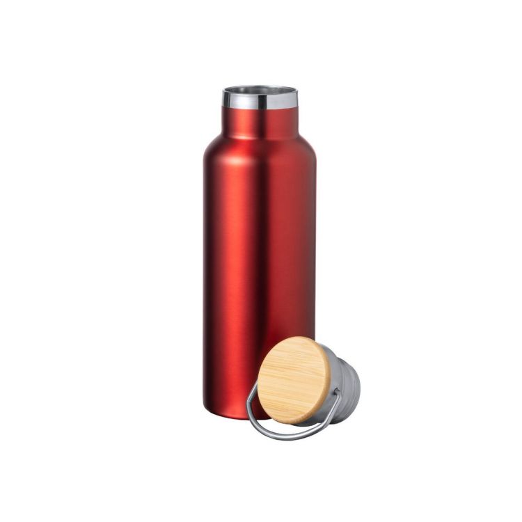 500 ml capacity thermal bottle, made in double wall, stainless steel. Including an original stainless steel screw cap with bamboo detail and integrated handle. Available in a wide range of colours, and presented in an individual box with kraft design.