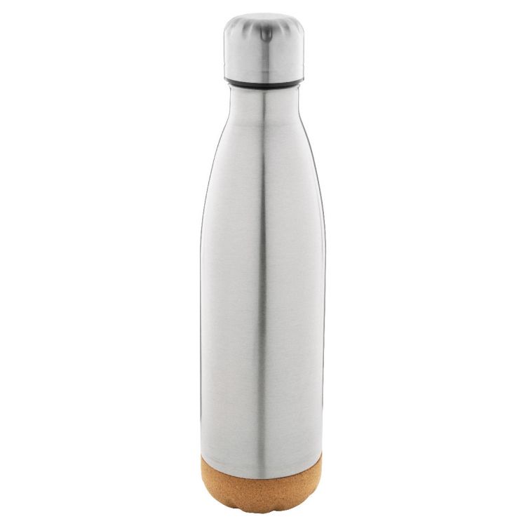 Double-wall, recycled stainless steel vacuum insulated bottle with natural cork base. 500 ml.