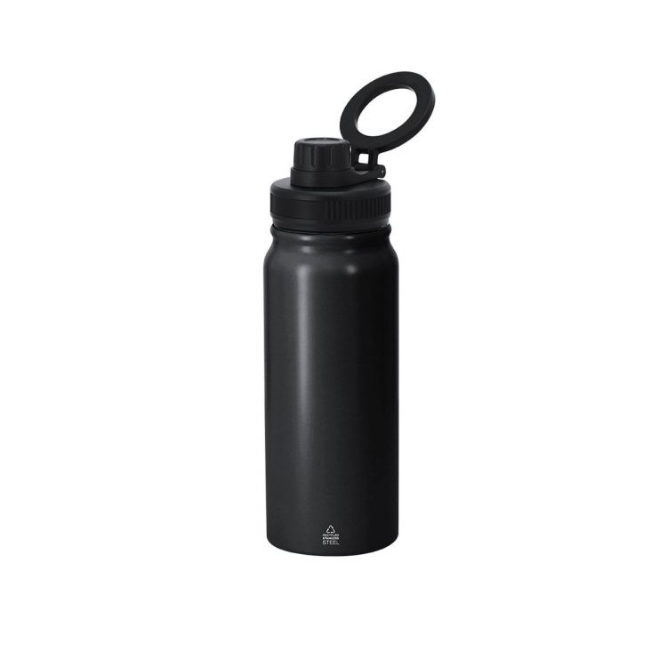 Thermal bottle with a capacity of 600 ml, made of Recycled Stainless Steel with double wall. With a rotating magnetic support function for smartphones. BPA-free. Includes Recycled Stainless Steel label.Steel is one of the most demanded materials and can be found almost everywhere, from daily-use products to large constructions. With countless properties, among which durability and high level of reusability stand out, making it a highly valued alternative in sustainability solutions. Properly treated, it allows obtaining new resources of infinite use. (black color)