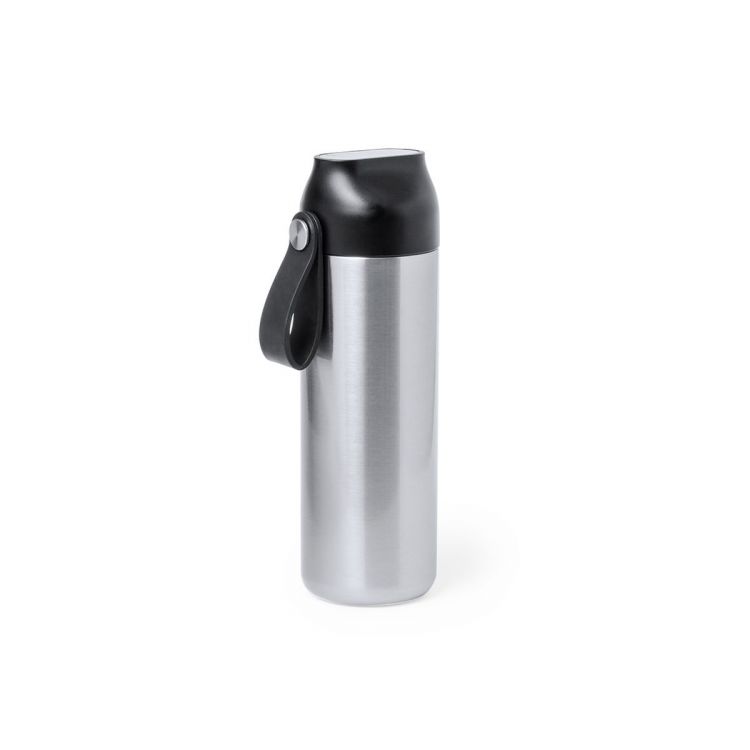 Double wall stainless steel thermal bottle with a capacity of 630 ml. Includes a tactile temperature indicator in the cap, with integrated handle. BPA free safety cap and presented in an attractive individual kraft design box in a recycled bag. Battery powered (button cell included), with instruction manual available in English and Spanish. (silver color)