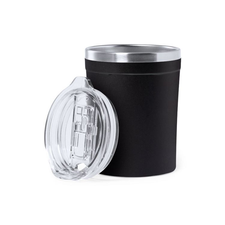 Table-top insulated cup made of stainless steel with a capacity of 350 ml. PP exterior, with dispenser and easy open lid. BPA free. Presented in individual kraft design box.