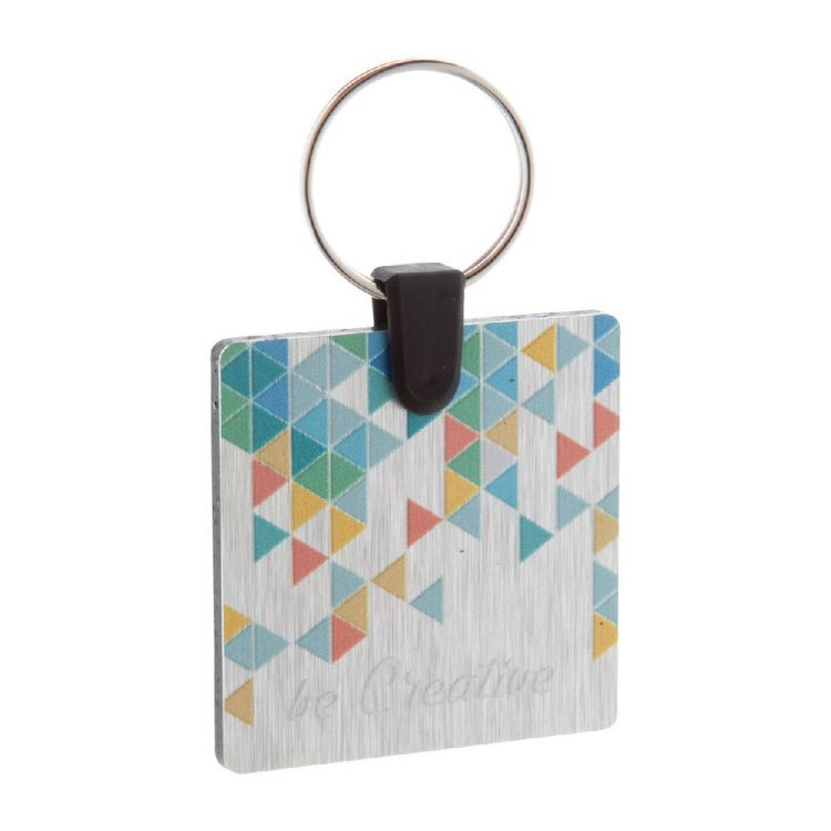Square shaped, brushed aluminium composite keyring with full colour printing. Price includes UV LED printing on one side. MOQ: 100 pcs