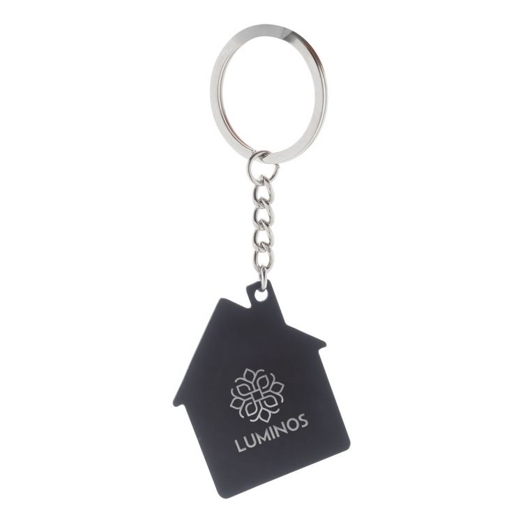 House shaped, recycled stainless steel keyring with rubberized finish. With special coating for mirror laser engraving, in black color