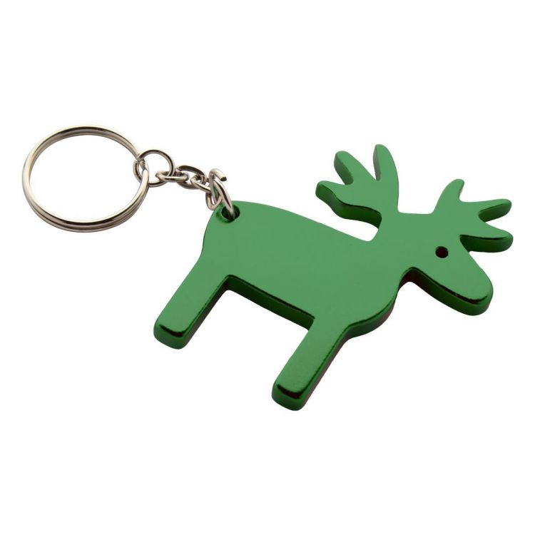 Reindeer shaped aluminium keyring, in green color